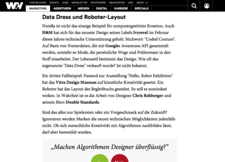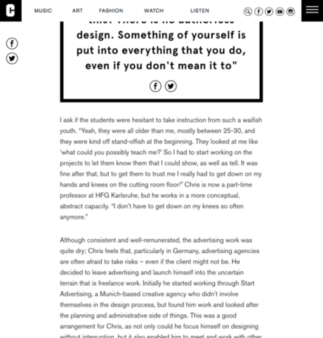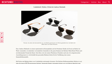 COMPUTERARTSNomadANDREAS MURKUDIS JOURNALTHE LOVELACE on Architonic.comITS NICE THAT ENSEMBLEMykita Perlon AchtungMykita Perlon VogueSchirn Magazine - family tiesNo Nonsense DesignWhat A ShowRobots and DesignersUnder The Covers with RAHOW - To Be In The SpotlightPunk SpiritFashion Show – Museum of Applied Arts BerlinExacting StandardsMASTERCLASSBold and big at it’s nice thatType Image Sign Exhibition Newspaper ReviewsBag it up Bag it in - The beauty of trashRedesigned reopening - Easy wayfinding in BerlinCreative for life - The extensive article in Creative Review
