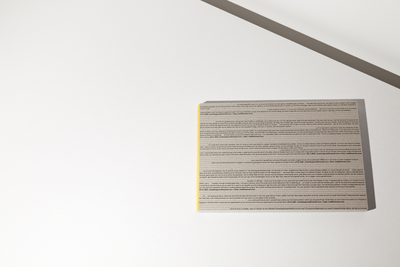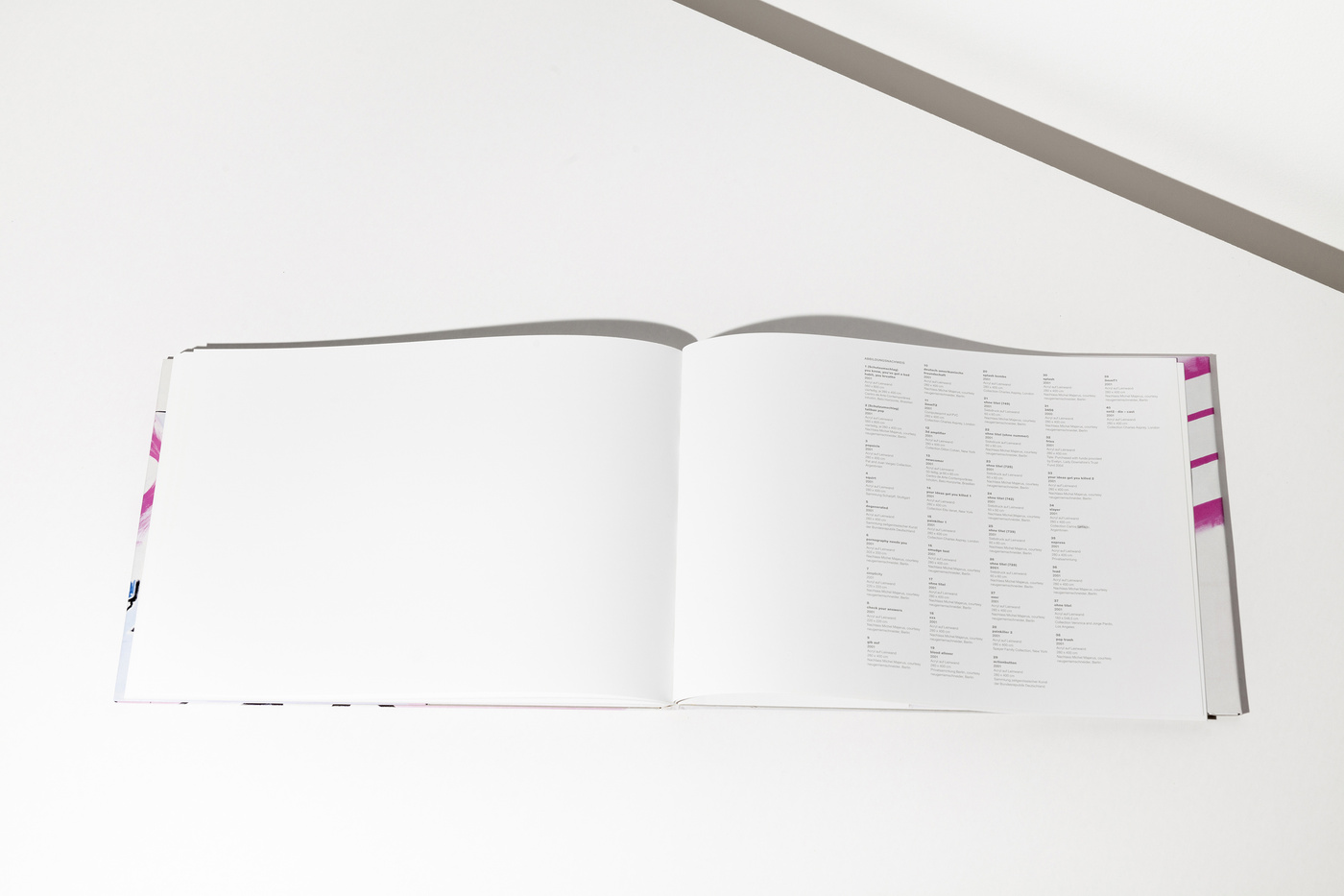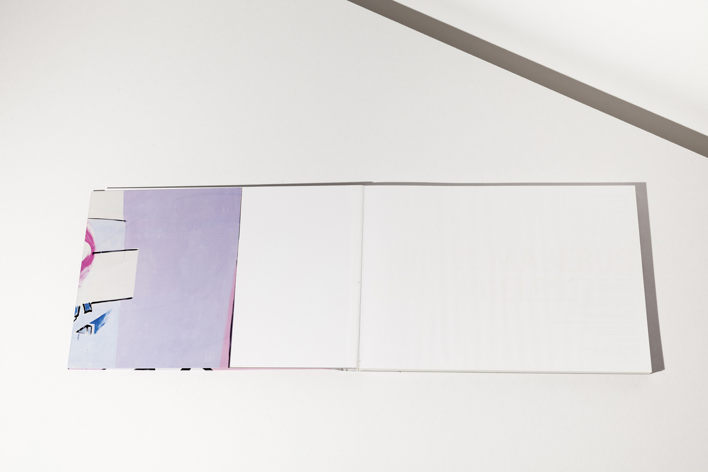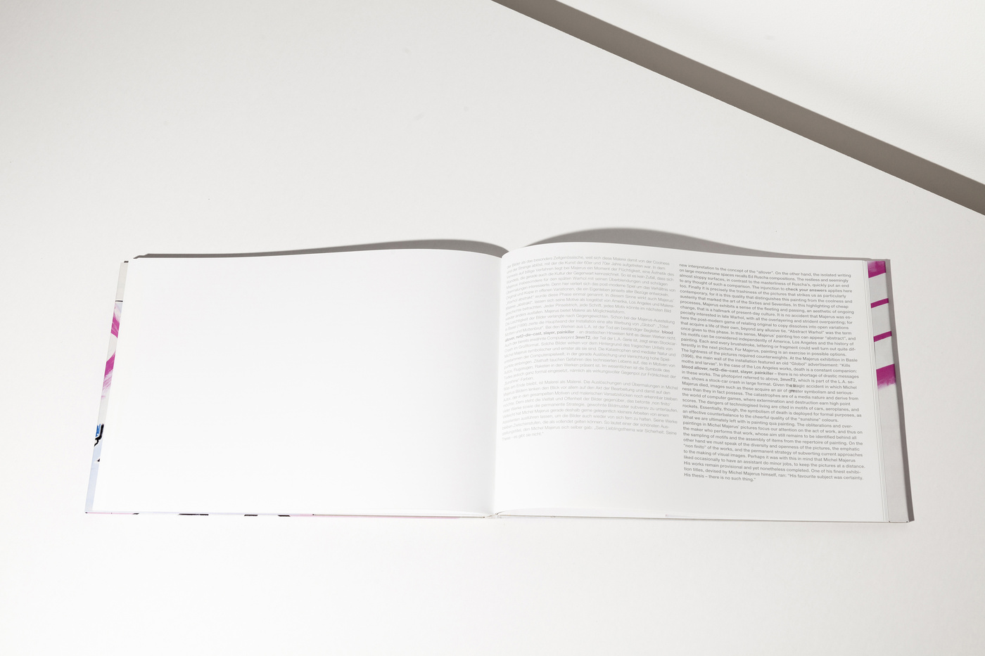 When Burkhard Riemschneider of neugerriemschneider asked us if we’d like to finish the catalogue of Michel Majerus it was not an easy yes for us. Of course we wanted to do the book. But Michel had just died a couple of months ago in a plane crash, and as if this wasn’t bad enough, he had started the design of the book by himself already. This meant that we had actually had to work on the original files of Michels’. What a nightmare that was to agree to finish what he had started. The first time we opened the QuarkXPress file it really felt extremely odd. A quite intimate moment – we felt like intruders. Apart from this it was a delight to go through his paintings and texts that came with this. The email conversations on the book case, hidden behind the dustcover that folded out to a double sided poster, were hilarious as were many of the paintings and prints in the book. He always knew how not to tell a joke by pointing in numerous directions to divert you into the dark .... and just by looking over your shoulder it became clear what he was aiming at.