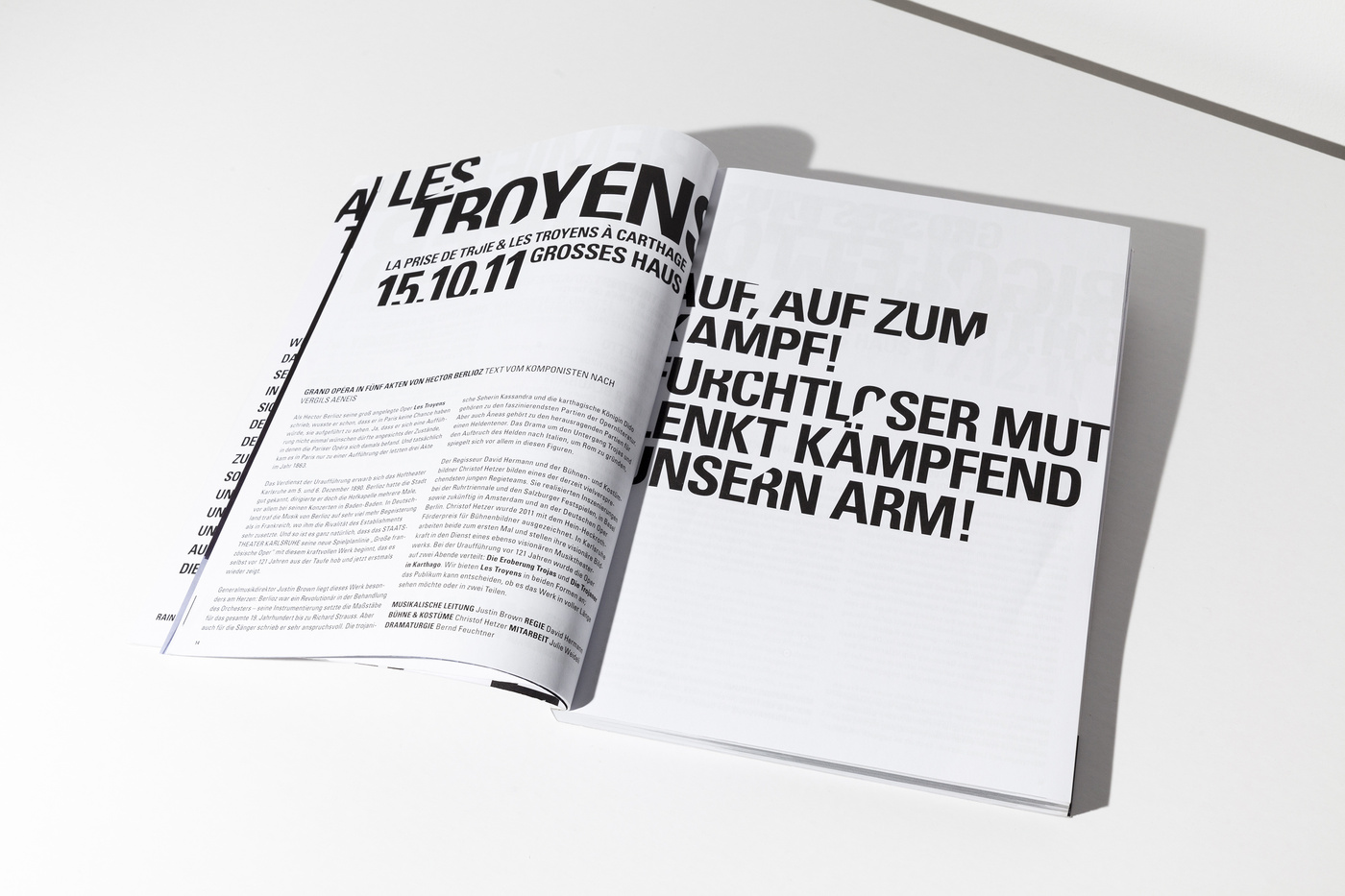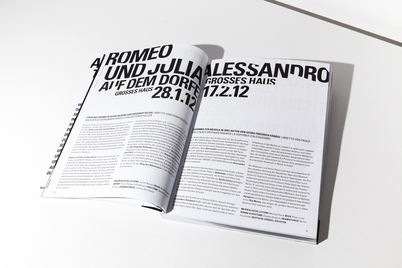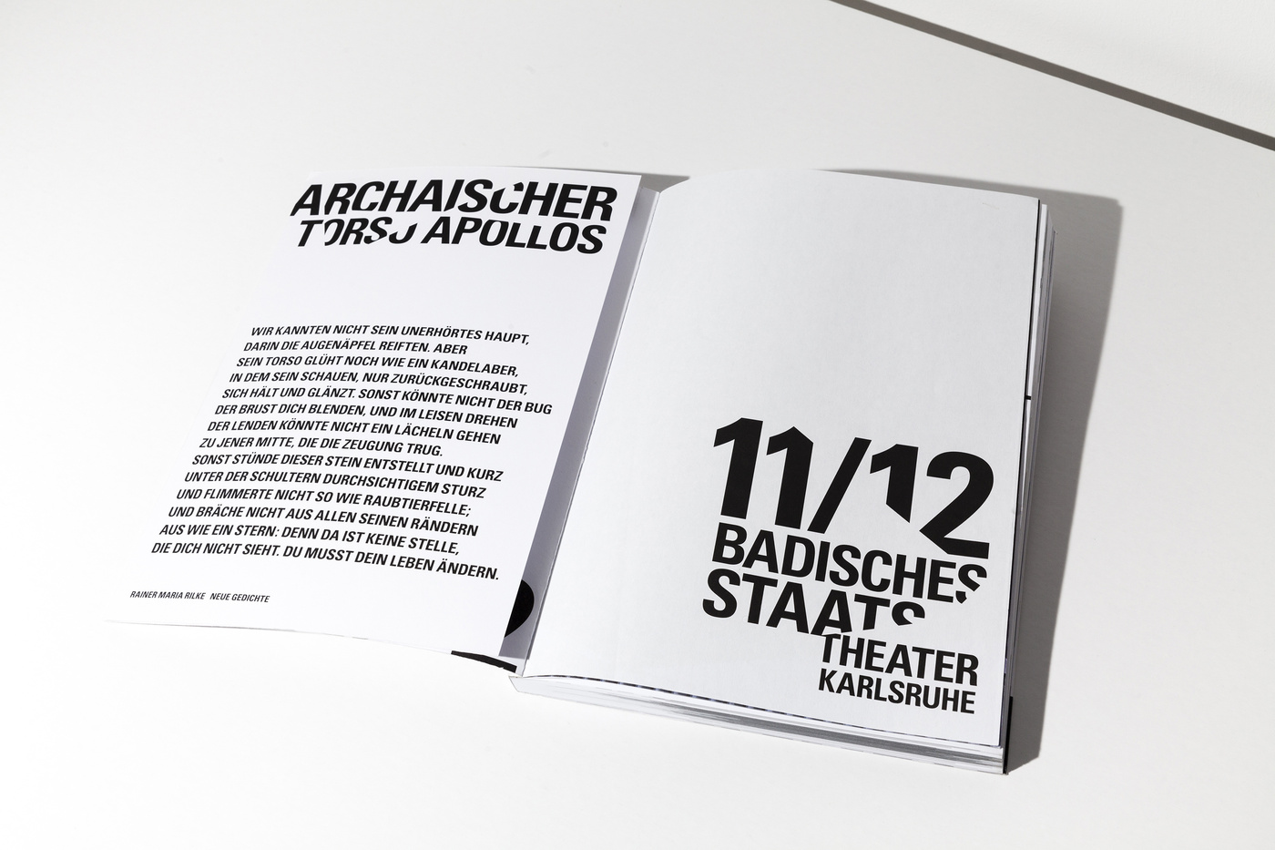 Usually we’re opposing the idea of using particular characteristics of architecture. Well, let’s say we don’t like melting buildings into an icon to use it as a logo. It seems to us just too simple to turn an already characteristic landmark into a graphic element ... you know all these uninspired signs. But in the case of the Badische Staatstheater Karlsruhe we had to, yes, had to, make an exception. We met Peter Spuhler, the director of the theatre, for the first time to take a look at the institution and the surrounding area, when he told us how much disliked the building was by the citizens of Karlsruhe. At first glance, it is quite a shocking picture how monolithic this bloc is situated in the city. There is roughly nothing appealing in the closest vicinity around the theatre that would make you want to stay longer that you would have to. This didn’t change much after we’ve entered and were standing in the lobby. But one thing was striking us. At first we didn’t realise what we were taking pictures of, but it became more and more clear that this is leading us to something useful. It were the crossing lines of the architecture, the sharp edges, that lead us to the conclusion that this is the route we wanted to take. Using the architecture as a sort of die, a cutter that punches out the typography creating a strange pattern by filling the space between the lines with words the architecture was leaving us with. It is, admittedly, somewhat odd you’ve got to work with ... but in the series, and using it in full extend to every little printed matter and detail, it absolutely works. Well, in the beginning the audience was wondering what this graphic garble was about, but now, of what we’re hearing, they got used to it and found a new love to their Badisches Staatstheater Karlsruhe.
