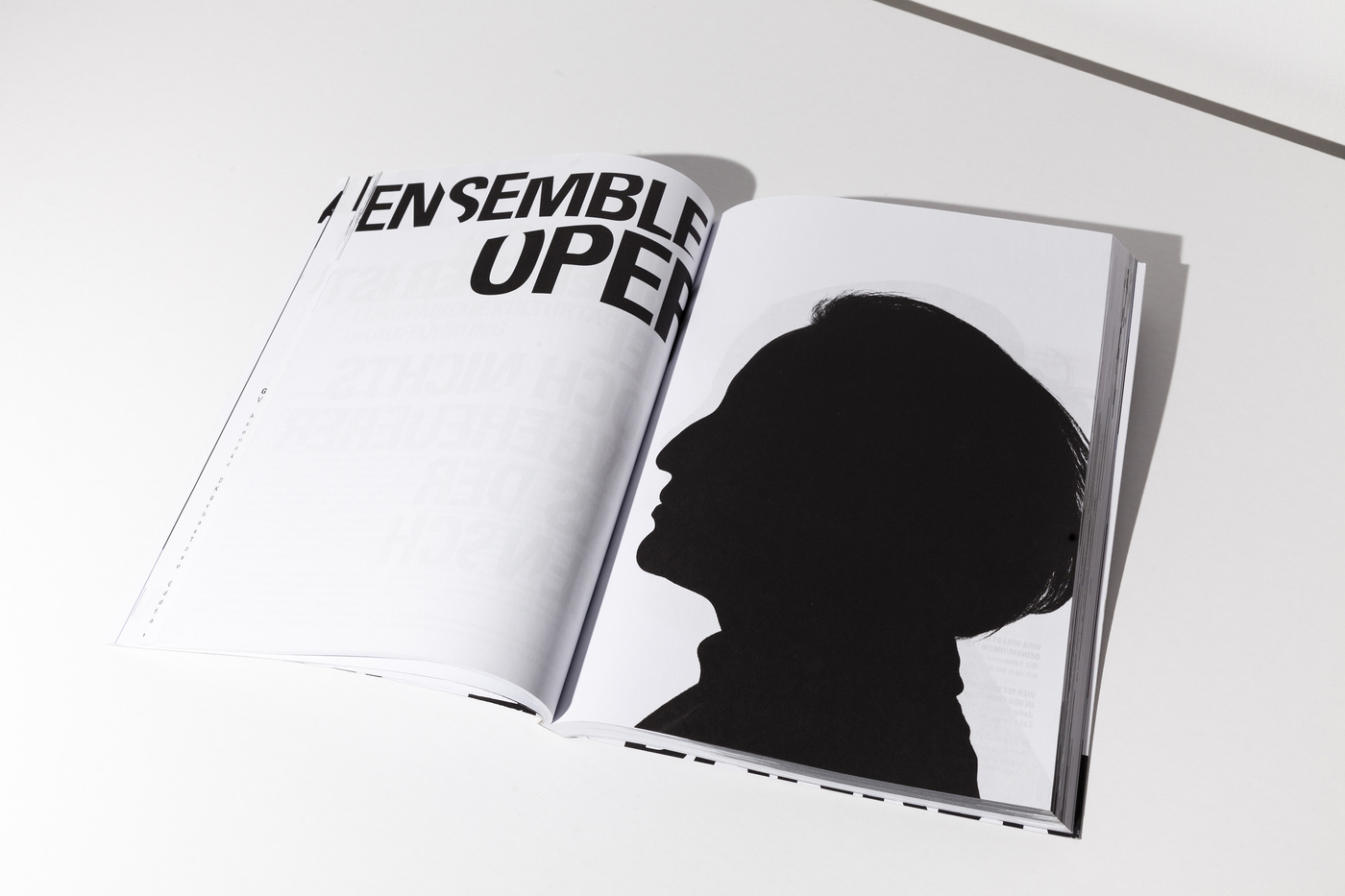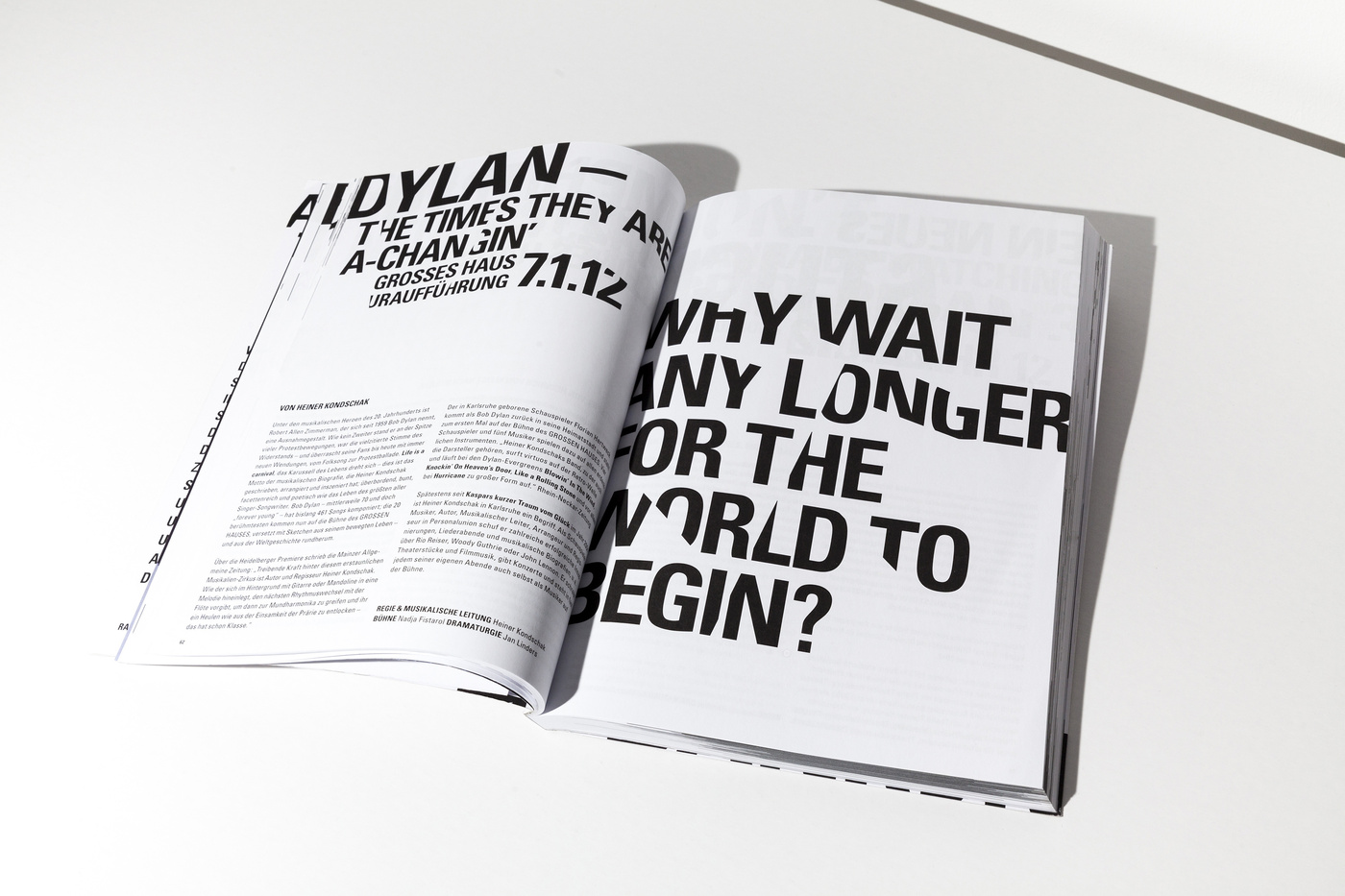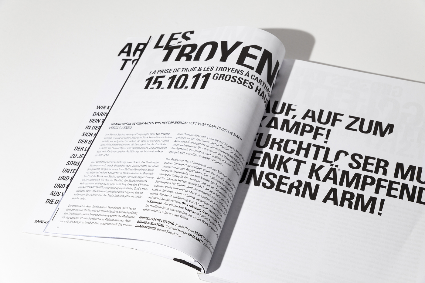 Usually we’re opposing the idea of using particular characteristics of architecture. Well, let’s say we don’t like melting buildings into an icon to use it as a logo. It seems to us just too simple to turn an already characteristic landmark into a graphic element ... you know all these uninspired signs. But in the case of the Badische Staatstheater Karlsruhe we had to, yes, had to, make an exception. We met Peter Spuhler, the director of the theatre, for the first time to take a look at the institution and the surrounding area, when he told us how much disliked the building was by the citizens of Karlsruhe. At first glance, it is quite a shocking picture how monolithic this bloc is situated in the city. There is roughly nothing appealing in the closest vicinity around the theatre that would make you want to stay longer that you would have to. This didn’t change much after we’ve entered and were standing in the lobby. But one thing was striking us. At first we didn’t realise what we were taking pictures of, but it became more and more clear that this is leading us to something useful. It were the crossing lines of the architecture, the sharp edges, that lead us to the conclusion that this is the route we wanted to take. Using the architecture as a sort of die, a cutter that punches out the typography creating a strange pattern by filling the space between the lines with words the architecture was leaving us with. It is, admittedly, somewhat odd you’ve got to work with ... but in the series, and using it in full extend to every little printed matter and detail, it absolutely works. Well, in the beginning the audience was wondering what this graphic garble was about, but now, of what we’re hearing, they got used to it and found a new love to their Badisches Staatstheater Karlsruhe.